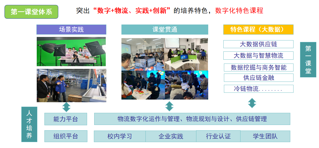 专业突出“数字+物流、实践+创新”的培养特色,教学体系设计以数字化物流管理人才为主体,以岗位素质模型和职业能力认证为驱动,对接区域产业数字转型的人才需求。